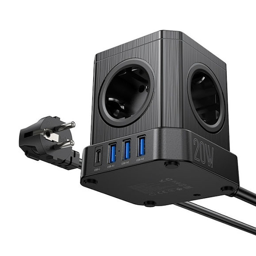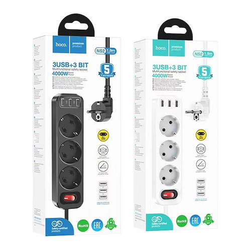 Hoco NS2 Aura Πολύπριζο 3 Θέσεων με Διακόπτη, 3 USB και Καλώδιο 1.8m Μαύρο