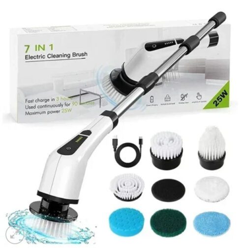 Πολυλειτουργική ηλεκτρική βούρτσα καθαρισμού 7 σε 1, 25W. Αυτή η ισχυρή συσκευή είναι εξοπλισμένη με επτά εναλλάξιμες κεφαλές, σχεδιασμένες για να αντιμετωπίζουν κάθε είδους βρωμιά και λεκέδες, από το μπάνιο και την κουζίνα μέχρι τα πλακάκια και τα έπιπλα.