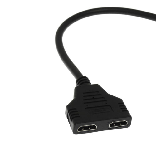 Αντάπτορας που συνδέει έναν αρσενικό ακροδέκτη HDMI με δύο θηλυκές θύρες HDMI.