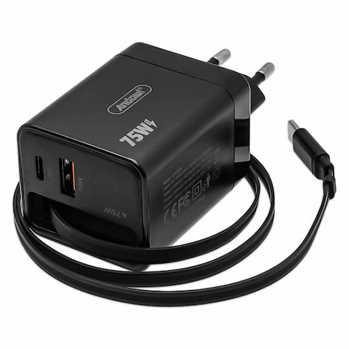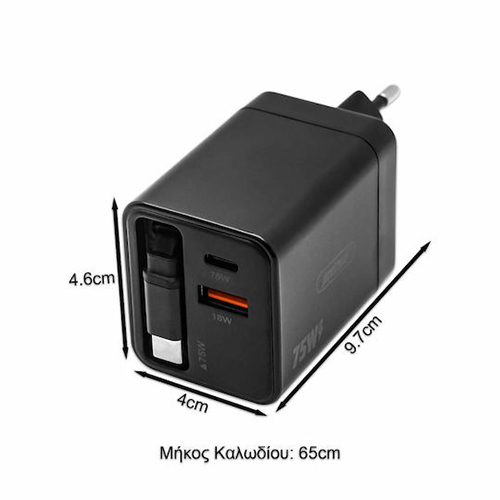 Andowl Φορτιστής με Ενσωματωμένο Καλώδιο με Θύρα USB-A και Θύρα USB-C USB-C 75W Power Delivery Μαύρος (Q-CD09)
