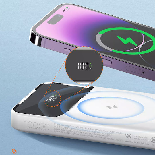Power Bank υψηλής χωρητικότητας 10000 mAh 37Wh με ασύρματη φόρτιση. Εξοπλισμένος με 2x θύρες USB και USB-C, υποστηρίζοντας τις τεχνολογίες Quick Charge και Power Delivery. Διαθέτει μαγνήτη.