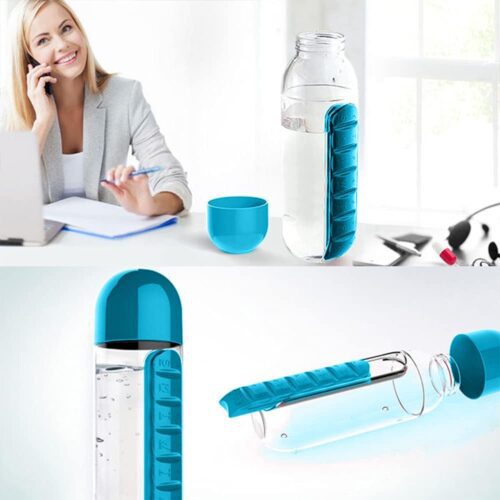 Το μπουκάλι νερού Pill Organizer των 600ml διαθέτει ένα ενσωματωμένο organizer χαπιών με επτά μικρότερα χωρίσματα για την κάθε ημέρα της εβδομάδας. Ένα πολύ έξυπνο gadget για να έχετε πάντα μαζί σας τα χάπια σας και το νερό σας χωρίς να χρειάζεται να ψάχνετε να αγοράσετε νερό.