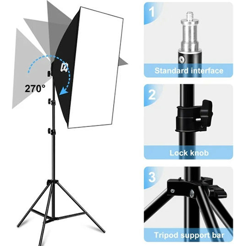 Το τρίποδο είναι κατασκευασμένο από αλουμίνιο υψηλής ποιότητας με ¼ βιδωτή βάση στην κορυφή, καθιστώντας το ανθεκτικό. Το ρυθμιζόμενο ύψος από 54 cm έως 2 m παρέχει ελευθερία στη χρήση. Επιπλέον, η γωνία φωτισμού του softbox μπορεί να ρυθμιστεί στις 270°, παρέχοντας επαρκή φωτισμό από πολλές γωνίες. Αυτό επιτρέπει σε όλους να το προσαρμόσουν ανάλογα με τις φωτογραφικές τους ανάγκες.